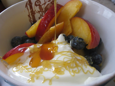 UPDATE: What They Had for Breakfast This is from iliea (the cheese girl) who wrote, "just thought you might be interested in what i had for breakfst too. this is a picture of frog hollow peaches, blueberries from the Ferry bldg farmers market, topped with Strauss Creamery whole milk yogurt, and finished with Snyders Farm oak wildflower honey. Oh, so good."