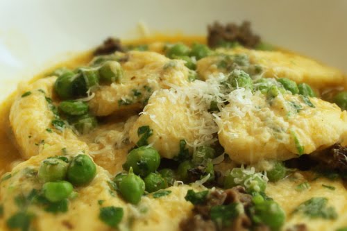 Here's the recipe. Take some mushrooms, preferable wild morel, and saute in olive oil until they smell meaty and delicious. Add some garlic and cook for a minute. Add some vegetable broth, about a 1/2 cup per person, and bring to a boil. Add some peas and cook until tender. Season, add a little cheese and fresh herb, and use as a sauce for the gnocchi.