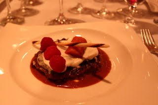 Dessert was crispy Cariabe chocolate polenta cake, with white chocolate, cajete, compressed rhubarb and strawberry chips. It was paired with a J Vineyards' Brut Rose NV. This was the most controversial dish, and our table had a spirited disccusssion of whether this worked or not.