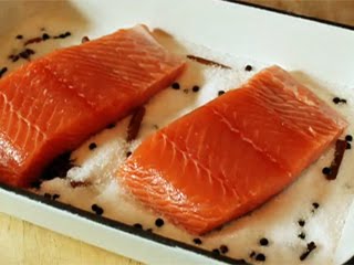 Thick center-cut salmon filets, skin-on, are simply placed over coarse salt, which has been liberally studded with aromatic spices, such as cinnamon, clove and star anise. As the salmon bakes on the heat absorbing and distributing salt, the aromas from the spices subtly permeate the fish.