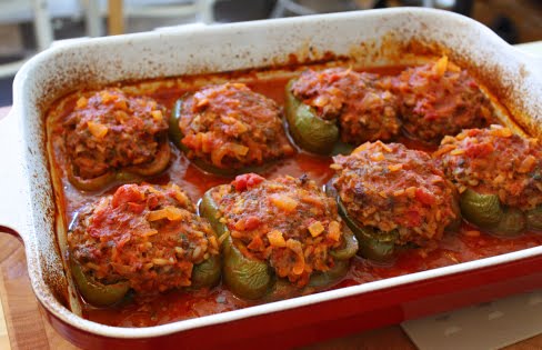 The peppers are now cut in half lengthwise, so that the meat/rice-to-pepper ratio is much more in our favor. The bad news is you must find evenly sized, and boxy shaped peppers so the halves cook evenly, but the good news is I just doubled your number of servings.