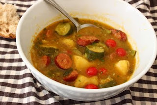 Ingredients: 1 tablespoons olive oil 1 pound spicy smoked sausage 1 onion, chopped 6 zucchini, cut in 2-inch pieces 1 1/2 pound small Yukon gold potatoes, cut same size as zucchini 1 quart vegetable or chicken broth water as needed salt and freshly ground black pepper to taste 1 bay leaf few springs of fresh thyme 1 tablespoon sliced fresh chives (and/or any fresh herb) handful of "sweet 100" cherry tomatoes *some crusty bread wouldn't be a bad idea