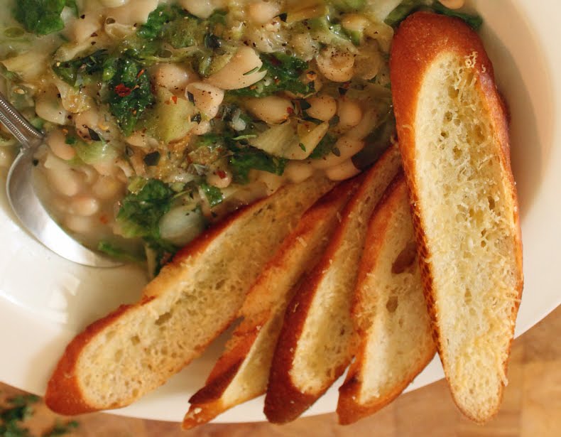 I had originally planned to post the beans and greens recipe seen herein with a simple suggestion to serve it with some delicious, Parmesan crostini. They're such a basic garnish that I take for granted you all know how to whip up a quick batch, when in fact some of you may have never attempted something like this before.