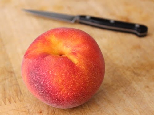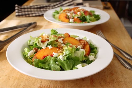 Then it hit me. It was made with real, full-grown, somewhat tough, slightly bitter greens. 95% of the salads I eat in restaurants these days are made with the ubiquitous "baby greens" – that bland, one-dimensional, melt-in-your-mouth mixture of lettuce, so soft and delicate you don't even need a set of teeth to eat them.This was the polar opposite of that. I had almost forgotten how interesting a salad could be! So, when Michele brought home a couple small heads of escarole one afternoon, I decided to film a salad recipe video, combining the mas macho greens with sweet peaches, goat cheese, and walnuts.
