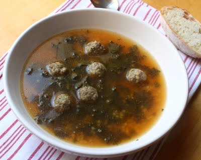 Ingredients: 1 quart beef broth 1 quart chicken broth Note: A little more or little less broth will not affect the recipe 1/3 cup pastina or other tiny pasta 1 bunch kale salt and pepper to taste For the meatballs: 1 1/4 pound beef 1 egg 2 cloves garlic 1/4 cup cream 1 cup fresh breadcrumbs 2 tbsp fresh parsley 1/2 cup grated Parmigiano-Reggiano 1 1/2 tsp salt 1/2 tsp fresh black pepper