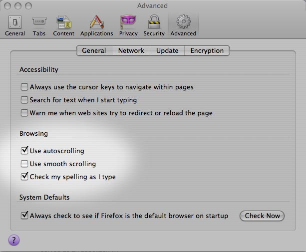Go into your browsers "Prefences" and in the "Advanced" settings, make sure you uncheck the "Use smooth scrolling" box (see illustration to the left). This should make the blog scroll much faster.