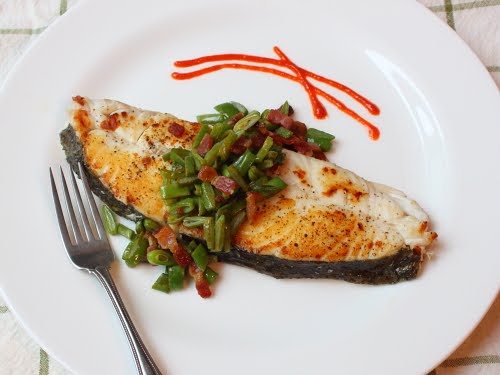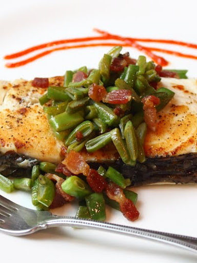 Ingredients for 4 servings: 4 oz bacon, sliced in 1/4-inch pieces 8 oz Roma beans, or other fresh green beans, sliced into 1/8-inch pieces 4 (7-oz) halibut steaks salt and fresh ground black pepper to taste 2 tablespoons freshly squeezed lemon juice Sriracha hot sauce, optional View the complete recipe