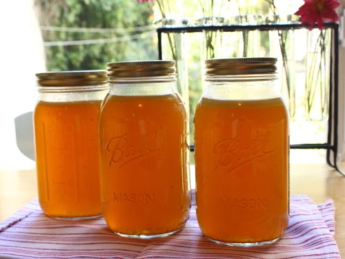 While I can often be seen using my carton of all-natural chicken broth, there's nothing like homemade. It does take a long time to simmer, but the actual work is minimal, and the procedure quite simple. It's also a very frugal undertaking, with the bones I used costing 80-cents a pound. That's three quarts of chicken stock for about $3 in costs!