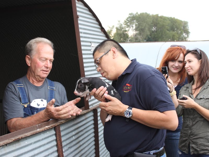 I'll be heading back to San Francisco on Sunday after a short, but enlightening visit to Iowa. I got to tour the Willis family hog farm on Friday, and attended the Niman Ranch Farmers Appreciation Dinner on Saturday. I have lots of photos and thoughts to share, but just couldn't wait to post this precious shot of San Francisco chef Alexander Ong passing a newly born piglet back to Paul Willis. Stay tuned for a full recap!