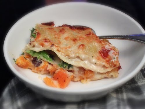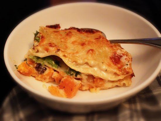 12 cooked lasagna noodles 8 oz mozzarella 3 or 4 cups cheese sauce (you can use this recipe here and use whatever cheese you like) 3 cups cubed roasted butternut squash 1 bunch cooked broccoli rabe parmesan as needed pepper flakes salt and pepper to taste *Note: the next version will included lemon zest and goat cheese
