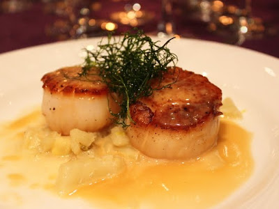 The main course, rack of lamb loin with pinot noir sauce and butternut squash puree, was expertly prepared also, but suffered from the bad luck of having to follow the scallops. The meat, infused with rosemary and garlic, was flavorful and retained an appropriate level of hydration (man, I would have loved to use "moist" right there). The local wild mushroom ragout alongside was spot on, and the butternut squash puree was butternut squash puree. Above and beyond the [whatever another awesome word that means delicious] food and wine, I was lucky enough to get several great tastes of home-brewed beer smuggled in by my favorite beer blogger (which I can't confirm or deny was Jesse from Beer and Nosh).