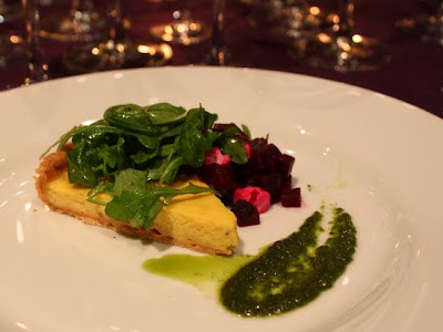 The first course was a roasted golden beet tart with feta, wild arugula, and puree of basil. I've never been a big beets guy, but nevertheless enjoyed this very much. The satisfying tart was impossibly light, almost weightless. The diced red beets alongside provided an excellent textural and visual foil.