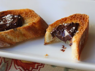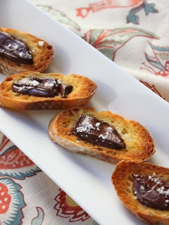 The biggest challenge with presenting this chocolate sea salt crostini recipe is getting people to stop thinking, "dessert," and start thinking, "great special occasion savory snack." Not that there's anything wrong with this as a dessert (it's actually Michele's "favorite" dessert), but for my money it makes for a better, and very unique, hors d'oeuvre.