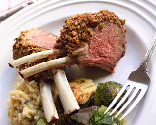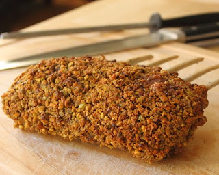 Ingredients for 4 Portions of Pistachio Crusted Rack of Lamb 2 fully trimmed racks of lamb (just under 1 1/2 pounds each) 1 teaspoon Herbes de Provence, or dried Italian herb blend salt and fresh ground black pepper to taste 1 tbsp vegetable oil or olive oil for searing 3 tbsp Dijon mustard For the crust: 2/3 cup finely chopped roasted pistachios 2 tablespoon plain bread crumbs 1 tablespoon melted butter 1 teaspoon olive oil pinch of salt and fresh ground black pepper *Note: the cooking time given in the video of 25 minutes will work if you are doing one or two, but if you load up the oven for a large group, you'll obviously need to increase the cooking time, as the oven temperature will drop. Use a thermometer to check the internal temperature. Remove at between 125 and 130 degrees F. for a nice pink center. View the complete recipe