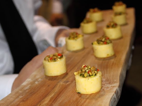 The festivities started with a cocktail hour in the plaza, and there are very few things I enjoy more than being surrounded by hundreds of chatting food bloggers enjoying wine and passed hors'douves. A couple of my favorites were these zucchini and parmesan madeleines filled with crimson cured salmon and lemon crème; and creamy polenta cups with goat cheese and Provencal vegetables.