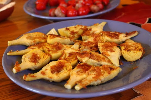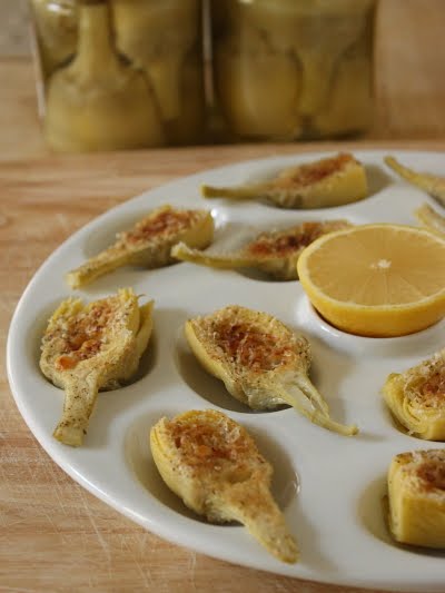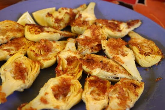 Artichoke Hearts Gratin Ingredients: Makes 12 halves 6 artichoke hearts, drained salt and fresh ground black pepper to taste 2-3 tablespoon plain breadcrumbs 1/4 cup finely grated Parmigiano Reggiano cheese 1 tablespoon olive oil lemon