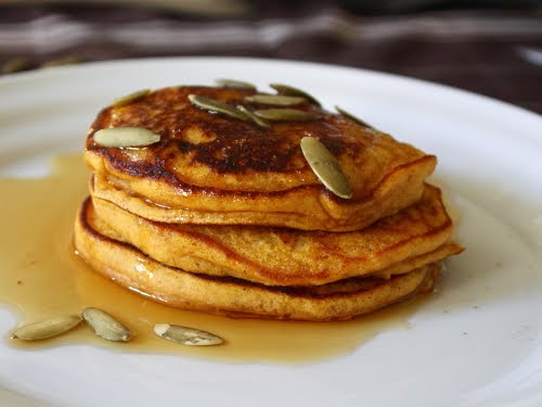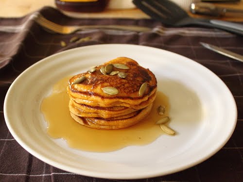 Pumpkin Pancakes Ingredients Mix in one bowl: 2 cups all-purpose flour 2 tablespoons brown sugar 1 tablespoon white sugar 2 teaspoons baking powder 1 teaspoon baking soda 1/2 teaspoon table salt Mix in another bowl: 1 cup pumpkin puree 1 teaspoon ground cinnamon 1/2 teaspoon ground ginger 1/2 teaspoon ground allspice 1 egg 1 1/2 cups milk 2 tablespoons vegetable oil 2 tablespoons lemon juice 2 teaspoon grated lemon zest Combine and make pumpkin pancakes!