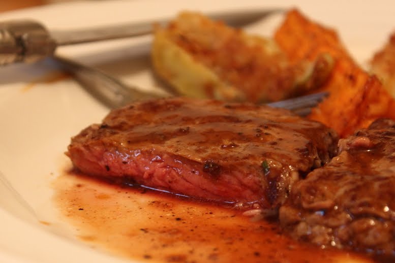 Of course, everyone knows that a minute steak is only as good as the pan sauce, and here we offer an ultra-simple barbecue butter sauce. Actually, there's only a very small amount of butter, but the way it emulsifies into the beef broth and tangy BBQ sauce somehow amplifies the effect.