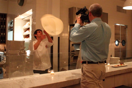 | Chef at Farina spinning the dough for the Foccacia di Recco. By the way, the videographer seen here is my friend Vincent McConeghy, a fellow western New Yorker, and author of the novel, Gastro Detective. |