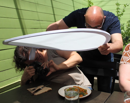 | I love this shot of Andrew showing my friend, Annelies, how to use a screen to adjust for the bright light reflecting off bald people’s heads. This is a technique that will serve me very well going forward. |