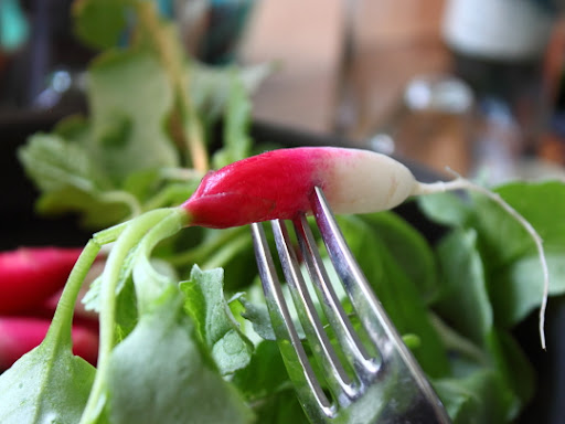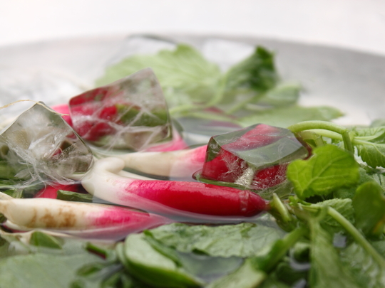 For the ice/radish photo...the eyes goes towards bright colors 1st. If you want to make ice the focus, don't put colors next to it. Unless you want color in the ice...(use either color transparent paper on lights or go crazy with juice ice cubes)