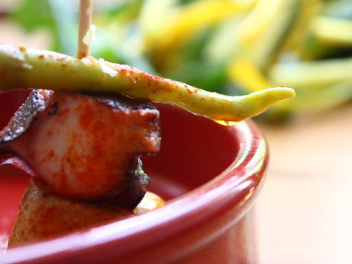 | This almost sexy octopus skewer photo is alright, but what I really love, is how if you look closely enough, you can see the entire universe in that drop of oil. I find that very relaxing. |