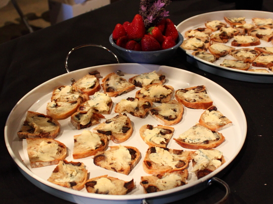 Ripe Cambozola Cheese on Fig Bread with Fresh Strawberries.