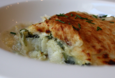 Riveting slip and falls notwithstanding, I think the real challenge in that environment would be trying to cook a decent meal. Imagine putting together this delicious, potato-crust-topped cod and spinach casserole in the galley of one of those boats. I actually get woozy thinking about it.