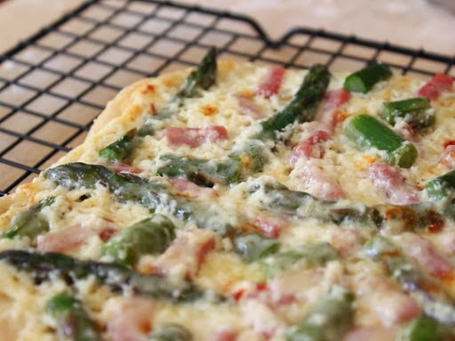 Asparagus, Ham, and Ricotta PizzaI generally don't like a lot vegetables on my pizza, since that's what salads are for, but asparagus with ham and ricotta is another story altogether. |